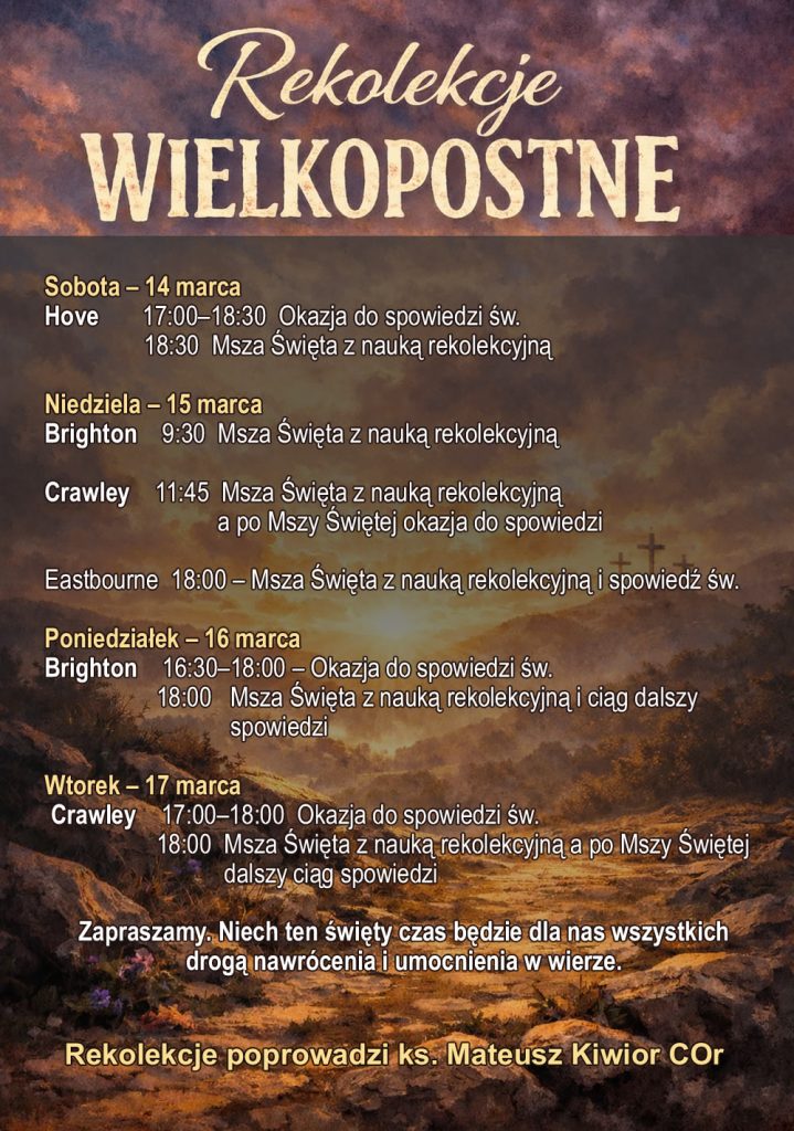 Crawley – godz. 11.45- Msza Święta z nauką rekolekcyjną; po Mszy Świętej okazja do spowiedzi