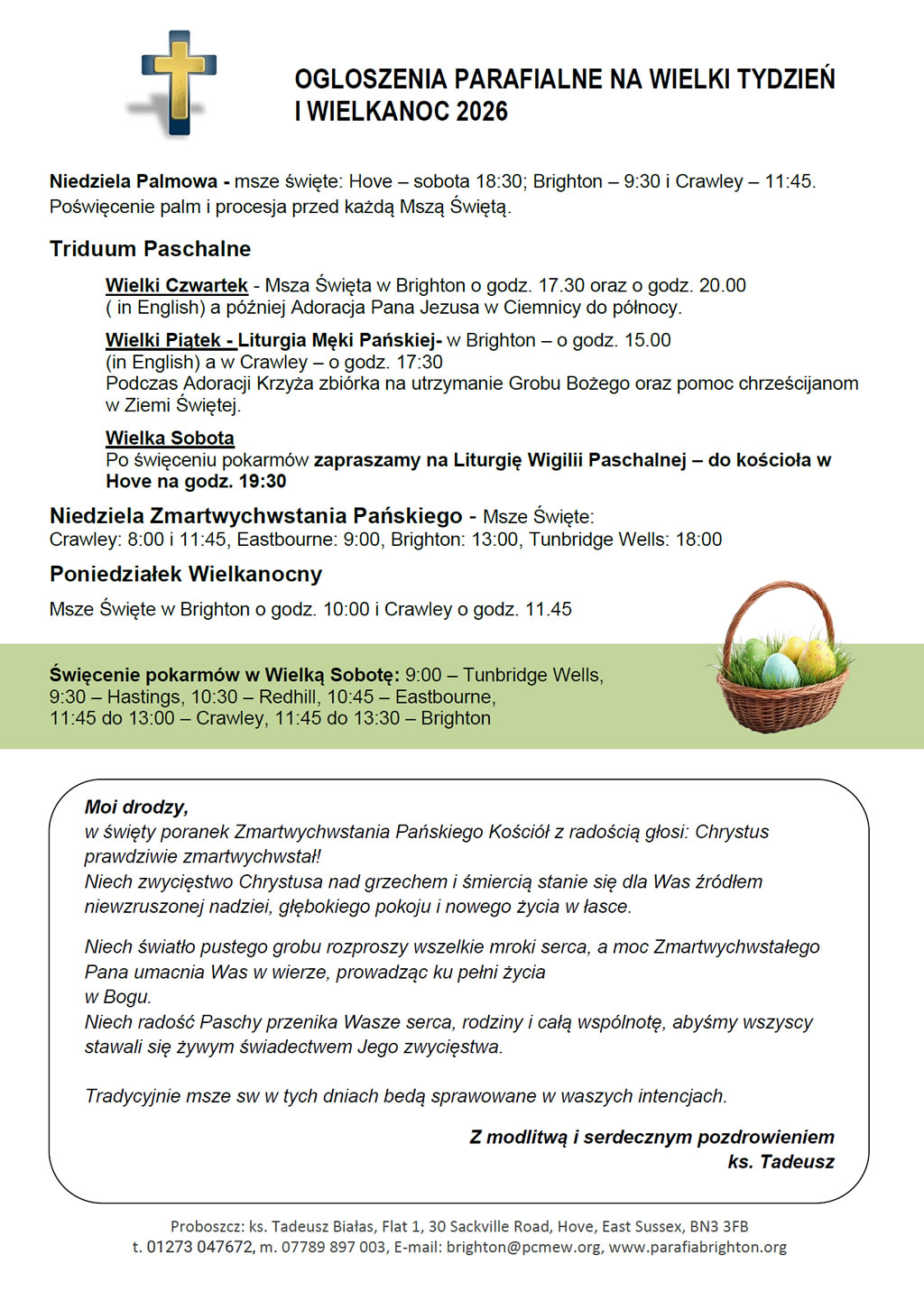 7. NIEDZIELA PALMOWA. Msze Święte (Hove, Brighton i Crawley) połączone z czytaniem Męki Pańskiej z podziałem na role. Palemki będą do nabycia bezpośrednio przed Mszami Świętymi.